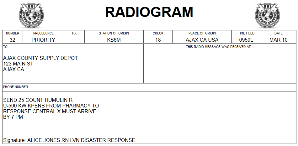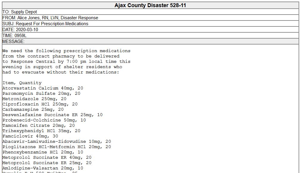 If you were paying attention, you saw that this was a message requesting a long and very detailed list of needed prescription medications for disaster evacuees. Though you may have been thinking that this message took a very long time to send and receive, imagine how long it would have taken, and how many errors are likely to have happened, if the message had been sent by voice!