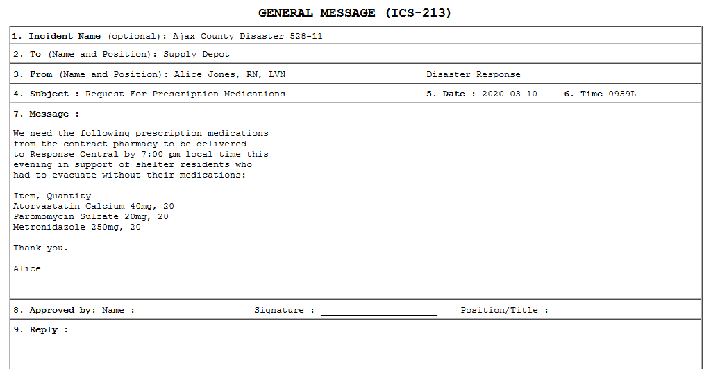 ICS-213 is a general message form used in the Incident Command System (ICS) component of the National Incident Management System, a framework used by governments and other entities in response to disasters and other incidents requiring a coordinated response. Note that the ICS-213 form provides for a reply, and as displayed in flmsg, the ICS-213 form enables the recipient to reply. You will use this feature in the next step of this course, Step 2.3.