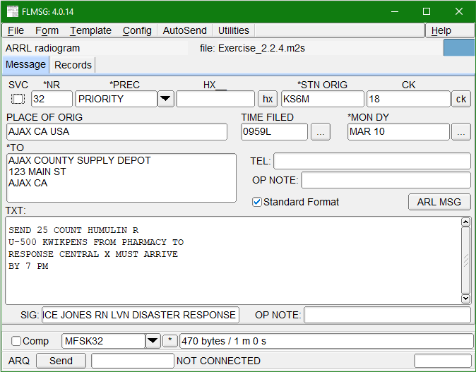 However, there are some problems. First, this message will almost certainly need to be printed by the receiving radio station, by fldigi does not provide an easy way to do that. The best that can be done is to scroll back in the receive panel, select the message content, and paste it into a text editor or word processor. You can do that with this example; go ahead and try it. Second, what if there had been a burst of static during transmission that corrupted some of the information? Are you sure that all the names of these medications came through accurately? Third and worst of all, what if the operator at the receiving station is distracted, or away from the desk, and does not notice that the message has even been received? The message has scrolled upward in the receive panel and is out of sight.