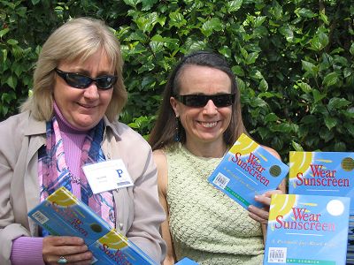 Talitha Arnold '75 and Mary Schmich '75 hawking Mary's book, Wear Sunscreen: A Primer for Real Life, at the book-signing next to Little Bridges. Mary is speaking at the Alumni Symposium.