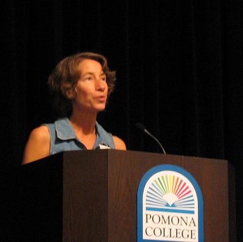 Eleanor Brown, at the Alumni Symposium lectern, introducing Mary Schmich in "So You Think You'd Like to Write a Column?".